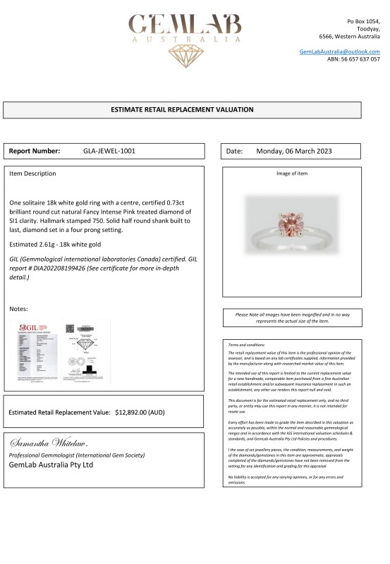 One solitaire 18k white gold ring with a centre, certified 0.73ct brilliant round cut natural Fancy Intense Pink treated diamond of SI1 clarity. Hallmark stamped 750. Solid half round shank built to last, diamond set in a four prong setting.